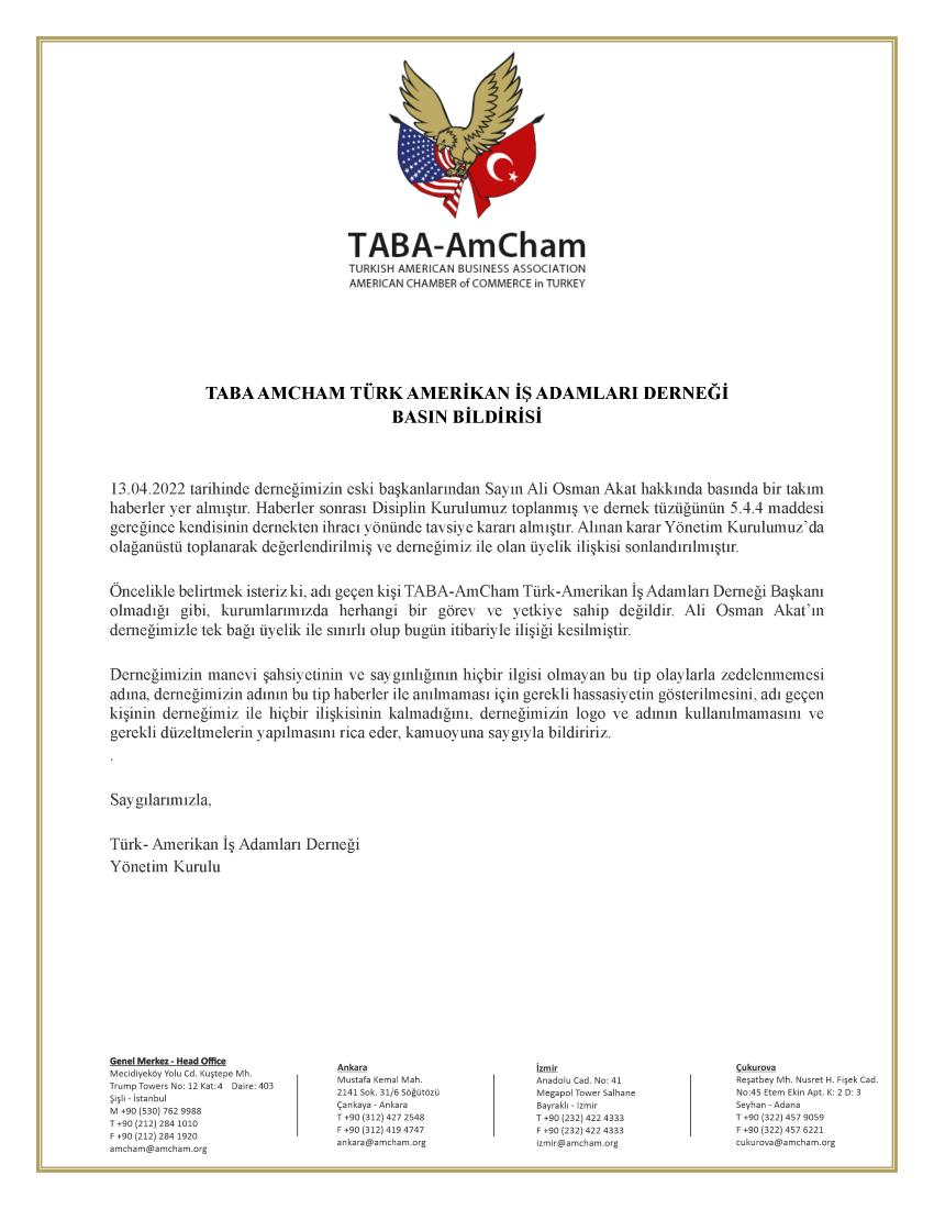 Öncelikle belirtmek isteriz ki, adı geçen kişi TABA-AmCham Türk-Amerikan İş Adamları Derneği Başkanı olmadığı gibi, kurumlarımızda herhangi bir görev ve yetkiye sahip değildir. Ali Osman Akat’ın derneğimizle tek bağı üyelik ile sınırlı olup bugün itibariyle ilişiği kesilmiştir.