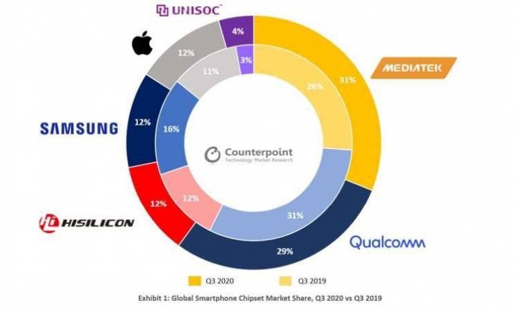 #Tayvan'ın MediaTek firması, ABD teknoloji devi Qualcomm'u geride bırakarak ve pazar araştırma kurumu Counterpoint'in tahminlerine göre Kore’deki Samsung ve Çin’deki HiSilicon’ın önünde lider konumunu pekiştirerek, 2020 yılının 3. çeyreğinde % 31 pazar payıyla dünyanın en büyük akıllı telefon yonga seti tedarikçisi oldu. 5G akıllı telefon pazarı için yarışın alevlenmeye devam etmesi ile Mediatek ve Qualcomm arasındaki şiddetli rekabetin daha da yoğunlaşması bekleniyor.