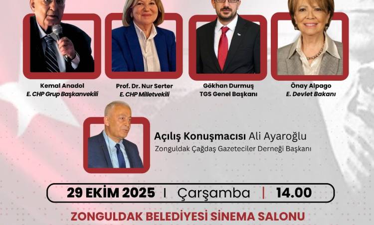 29 Ekim 2025 Çarşamba günü, saat 14.30'da Zonguldak Belediyesi Sineması’nda düzenlenecek olan panelde; Kemalist Aydınlanma Derneği Kurucu Başkanı ve Geçmiş Dönem CHP Grup Başkanvekili Kemal Anadol yönetici (moderatör) olarak yer alacak. Panelde konuşmacı olarak ise Geçmiş Dönem Devlet Bakanı Önay Alpago, Geçmiş Dönem CHP Milletvekili ve MYK Üyesi Prof. Dr. Nur Serter ve Türkiye Gazeteciler Sendikası Genel Başkanı Gökhan Durmuş bulunacak.