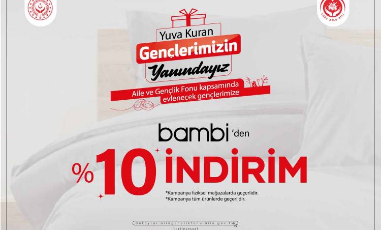 Türkiye yatak pazarının öncü markası Bambi Yatak, T.C. Aile ve Sosyal Hizmetler Bakanlığı tarafından Aile ve Gençlik Fonu kapsamında yürütülen “Evlenecek Gençlerin Desteklenmesi Projesi” çerçevesinde yeni bir kampanya başlattı. 18 Temmuz 2026’ya kadar Bambi Yatak mağazalarında geçerli kampanya kapsamında tüm ürünlerde, yuva kuracak gençlere özel yüzde 10 indirim uygulanacak.