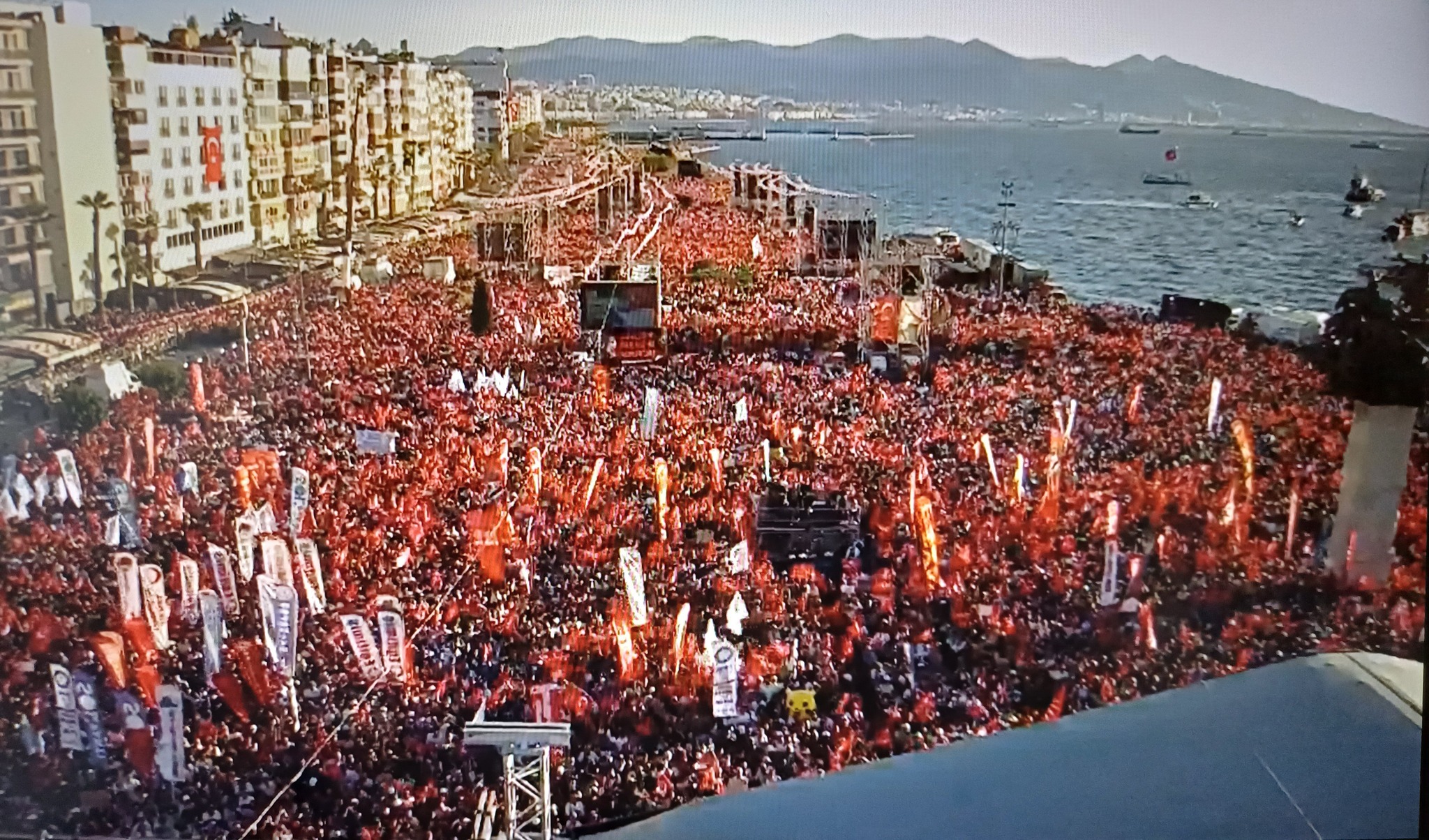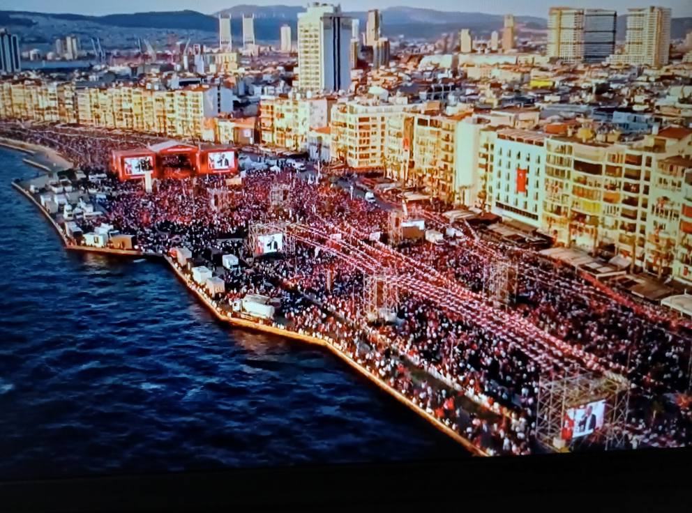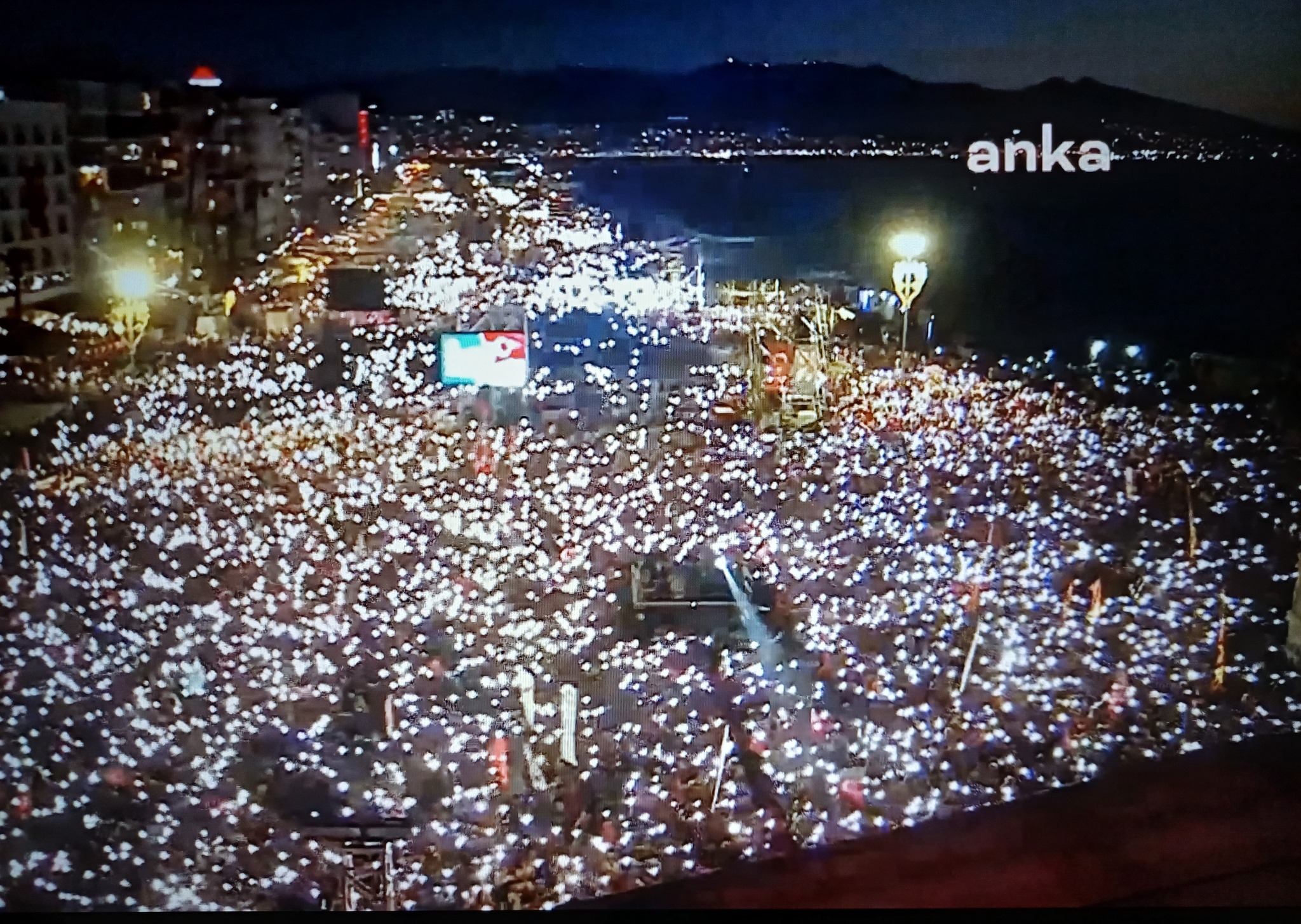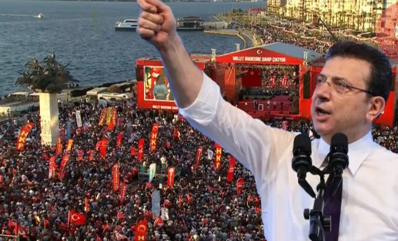 "19 Mayıs 2025, 19 Mart darbesinden 60 gün sonra Tayyip Erdoğan'a, 'Bir aya kalmaz ortaya belgeler dökülünce birbirlerinin, ailelerinin yüzüne bakamayacaklar' diyen Erdoğan’a Gündoğdu Meydanı’ndan sesleniyorum. Burada iki milyonun üzerinde İzmirlinin gözünün içine baka baka söylüyorum, Ekrem Başkan ve arkadaşlarımız suçsuzdur. Hiçbir iftiranı kanıtlayamadın, hepsi yalan, hepsi iftira. Kaybedeceğin için yarışmaktan korkuyorsun, iftira atıyorsun. Ey Erdoğan, 'ahtapot' diyorsun, 'suç örgütü' diyorsun, kul hakkına girmekten çekinmiyorsun. O zaman sana İzmir’den, bu meydandan meydan okuyoruz, gel bu yargılamayı TRT’den canlı yayınlayalım. Kim masum, kim iftiracı bu aziz millet görsün. TRT bu meydanı görmez. TRT bu meydandan vergiyi toplar, saraya hizmet eder. Ama buradan TRT’nin değerli çalışanını, kameramanını, muhabirini, yönetmenini, emekçisini selamlıyorum. Ama bu TRT’yi Erdoğan’a kul eden yöneticilere söylüyorum, gün gelecek devran dönecek bunu yapanlar bu millete hesap verecek.
