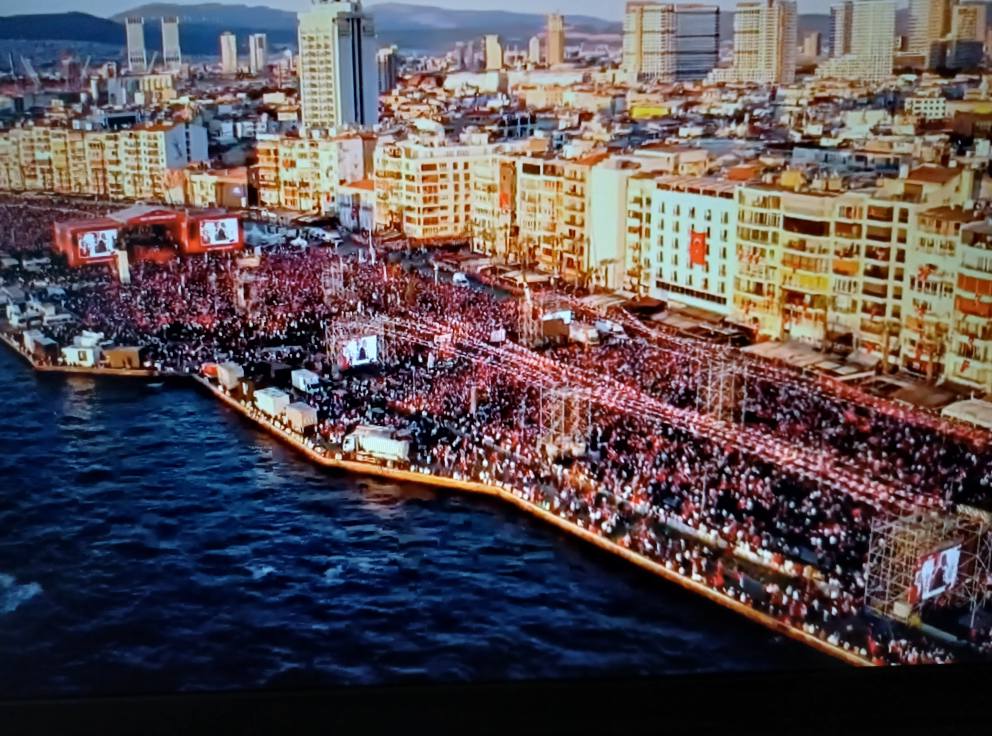 "İkisinin de bir darbe planı, elbette başında bir cuntası ve elbette bir karargahı var. Türkiye’de yaşanan 19 Mart darbesinin karargahı saraydır, Beştepe’dir. Silahı yargıdır. Bu silahın mühimmatı, bu silahın kurşunu yalandır, iftiradır. Darbeciler bu kez kamuflajla değil, cübbeyle gelmiştir. Çünkü Erdoğan, İmamoğlu ile sandıkta yarışmaktan korkmuştur. Ekrem Başkanımız aday olacağını açıkladıktan sonra, önce 18 Mart’ta bir iftar vaktinde 31 yıllık diplomasını iptal ettiler. Yetmedi, takip eden sahur vaktinde yüzlerce polisle evini bastılar ama 60 gün geçti hala hiçbir iddialarını ispat edemediler. Adı olmayan, yüzü olmayan gizli tanıkların arkasına saklandılar ve öyle bir noktaya geldik ki ne yalanlar ne iftira attılar. Ergenekon ve Balyoz kumpaslarındaki gibi bu millete yine bir kumpas kurdular. Bu Erdoğan zaman zaman grup toplantılarında, zaman zaman bazı mitinglerde kurmaca videolarla milleti kandırmaya çalışıyor ya biz onun gibi yapmayalım. Biz size, millete, İzmir’den onu ve yalanlarını izletelim. Bir görün bakalım geçmişte ne demiş ne olmuş? Biz izleyin bakalım bu Erdoğan’a inanılacak bir taraf var mıymış yok muymuş?"