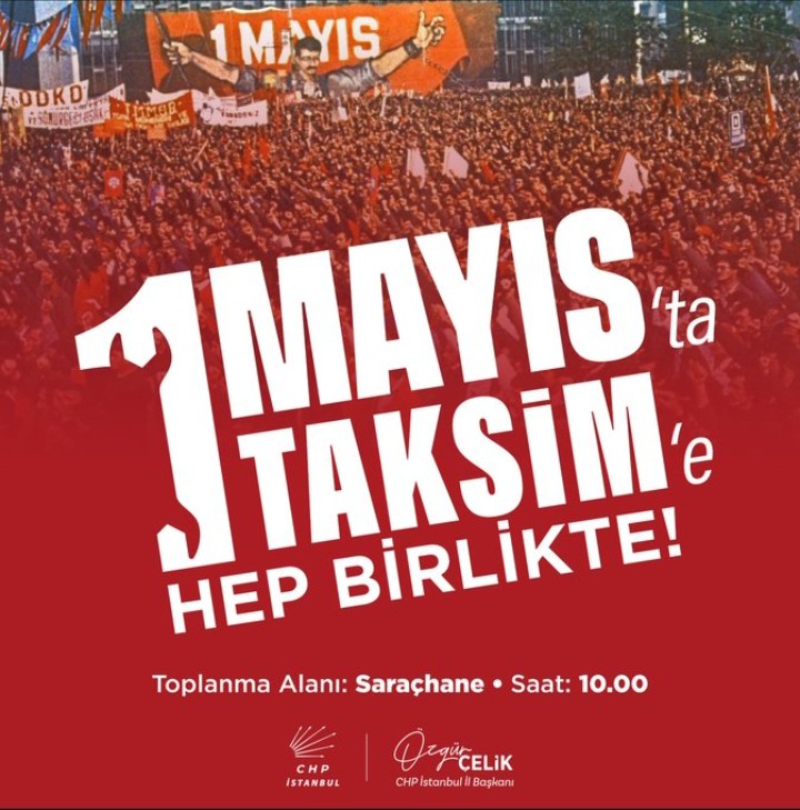 CHP İstanbul İl Başkanı Özgür Çelik, 1 Mayıs İşçi Bayramı için Taksim çağrısı yaptı. CHP İstanbul İl Örgütü, 1 Mayıs saat 10.00’da Saraçhane’de buluşarak Taksim’e yürüyecek.