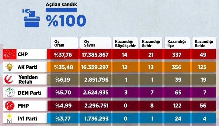 Yeniden Refah Partisi (YRP), Şanlıurfa ve Yozgat’ta belediye başkanlıklarını aldı. Türkiye genelinde oy oranı yüzde 3.8’lerde kalan İYİ Parti sadece Nevşehir’de ipi göğüsledi. 2019’da yüzde 2.7 oy alan Saadet Partisi (SP) ise ciddi bir varlık gösteremedi. Sadece bir ilçede seçimi kazanan SP’nin oy oranı yüzde 1 civarında kaldı.
