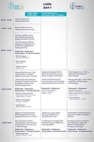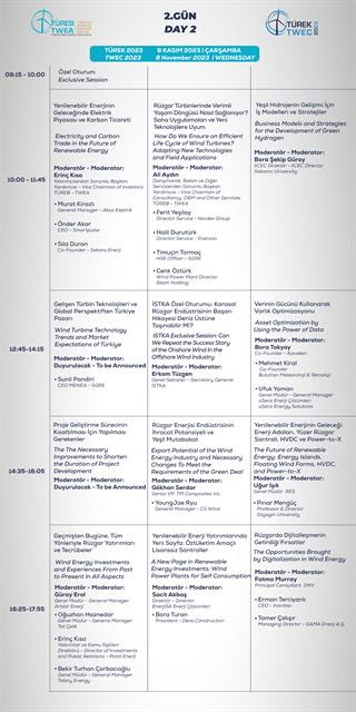 12. Türkiye Rüzgar Enerjisi Kongresi yatırımlar, sanayi gelişimi, finans, servis bakım ve karasal rüzgarın ağırlıklı olduğu konu başlıklarının yanı sıra geçtiğimiz yıl başlatılan ‘Geleceğin Rüzgarı’ vizyoner etkinliği çerçevesinde enerji depolama, deniz üstü rüzgar enerjisi, hibrit ve hidrojenle ilgili ayrı bir bölümü de içerecek. Avrupalı türbin ve aksam üreticilerinin tedarik zinciri yöneticilerinin TÜREK 2023 kapsamında Türk tedarikçilerle doğrudan buluşturulmasına imkan verecek olan “Türk Tedarikçiler Günü” etkinliği ise WindEurope iş birliğiyle bu yıl ilk kez hayata geçirilecek.