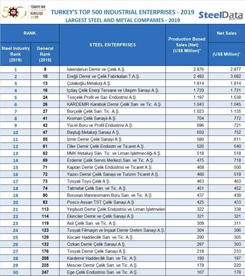 İskenderun Demir Çelik ve Ereğli Demir Çelik sekizinci ve onuncu sıradan listeye girerken. Demir – Çelik Endüstrisinin ilk iki sırasını paylaştılar. Kardemir Demir Çelik genel sıralamada 26. Sıradan listeye girerken Demir Çelik Endütri’sinin 6. Firması oldu. İzmir Demir Çelik Genelde 55. Sıradan, Erdemir Demir Çelik 69 sıradan, Borusan Mannesmain 80. Sıradan, Ege Çelik Endütrisi 247. Sıradan genel listeye girdi. Demir – Çelik Endüstrisi sıralaması ise; İzmir Demir Çelik 11. Sıradan, , Erdemir Demir Çelik 14. sıradan, Borusan Mannesmain 19. Sıradan, Ege Çelik Endütrisi 30. Sıradan listeye girdi.