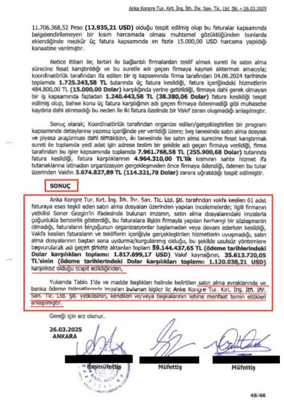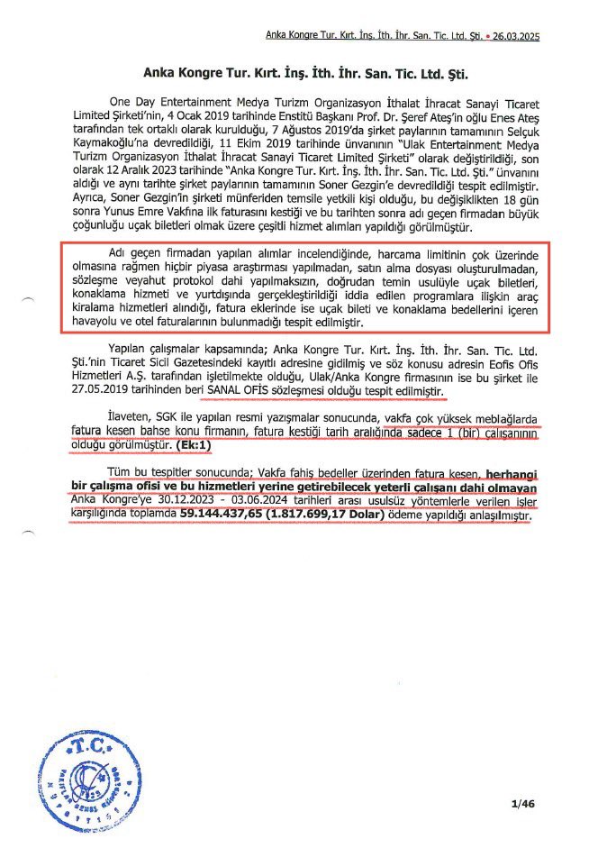 "Organize işler! AK Parti'nin bir ahtapot gibi sardığı Yunus Emre Vakfı’nda; Anka Kongre Turizm adlı organizasyon şirketinin 5 ayda kazandığı 61 ihalede yolsuzluk yapıldığını tespit ettik. Yolsuzluk tutarı: 1 milyon 120 bin 38 Dolar. Güncel kurla: 43 milyon 457 bin TL. Dosyada AK Partili bir Bakanın ve MHP’li bir yöneticinin, aile bireylerinin de adı geçiyor.