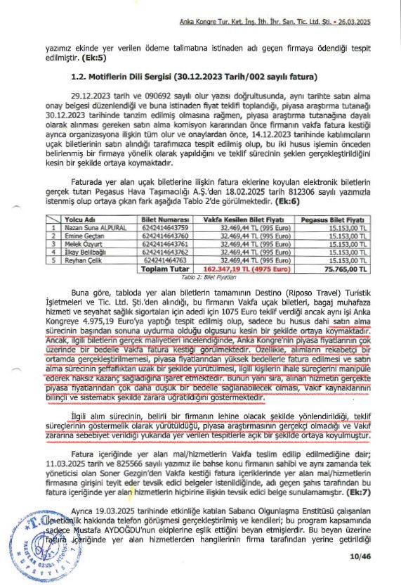 Vakıflar Genel Müdürlüğü Teftiş Kurulu müfettişlerince hazırlanan soruşturma dosyasına atıf yapan Yavuzyılmaz, ihalelerin satın alma süreçlerinin tamamının göstermelik yürütüldüğünü, tekliflerin sahte belgelerle oluşturulduğunu ifade etti.