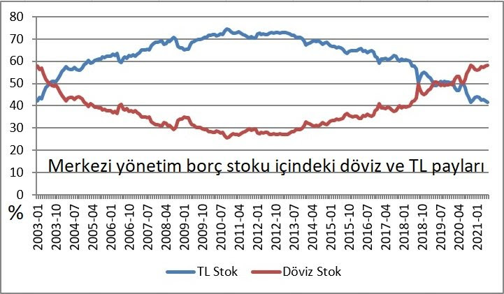 Merkezi yönetim borç stoku içinde döviz ve altın cinsi borcun payı, haziranda yüzde 58,3'lük orana ulaşarak, 2003 yılına kadar giden veriler içinde yeniden zirveyi gördü.