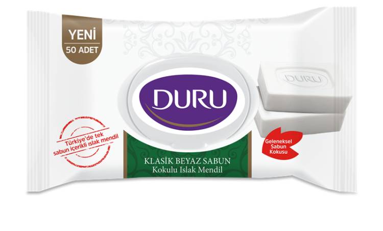 Duru, tüketici ihtiyaç ve beklentilerine yenilikçi ürünlerle cevap vermeye devam ediyor. Duru’nun yeni ürünü Klasik Beyaz Sabun Kokulu Islak Mendil, Türkiye’de sabun içerikli tek ıslak mendil! Temizlik hissinin en doğal sembolü olan geleneksel sabun kokusunu ıslak mendil ile buluşturan Duru Klasik Beyaz Sabun Kokulu Islak Mendil, su ve sabun içeren özel formülüyle pratik bir temizlik sağlıyor. Duru Klasik Beyaz Sabun Kokulu Islak Mendil, alkol ve paraben içermiyor ve ciltte yapışkan his bırakmıyor.