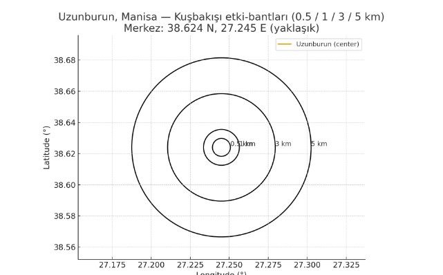 İşte harita — Uzunburun (yaklaşık 38.624 N, 27.245 E) merkezli 0.5 / 1 / 3 / 5 km kuşbakışı etki-bantları görseli.