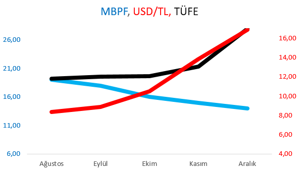 Bu çerçevede Merkez Bankası Eylül ayında % 19 olan politika faizini yüzde 18’e sonra da sırasıyla 16, 15 ve 14’e düşürdü. Faizi düşürünce kur fırladı ve arkasından enflasyonu çekip getirdi.