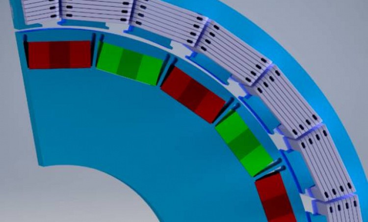 The implemented casted coils, which enable the direct liquid cooling, can be seen in Figures 2 to 4. The high current density as well as the – compared to standard motors – higher eddy current losses and thus higher operating temperatures of the PM lead to choosing samarium-cobalt magnets. Those magnets possess a high remanence flux density as well as a high resilience against partial demagnetizations at high temperatures.