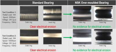 Kapsamlı NSK testleri, üst kalıplanmış rulmanların performansını şirketin standart rulmanlarına kıyasla ortaya koyuyor. Örneğin, 24 V voltajda ve 15 kHz frekansta, standart rulmanlar, iç ve dış bileziklerde bariz bir elektriksel erozyon gösterdi. Buna karşılık, yeni NSK üst-kalıplanmış yatakları bu fenomene dair hiçbir kanıt göstermedi. Aynı sonuç, çeşitli dönme hızlarında gözlendi.
