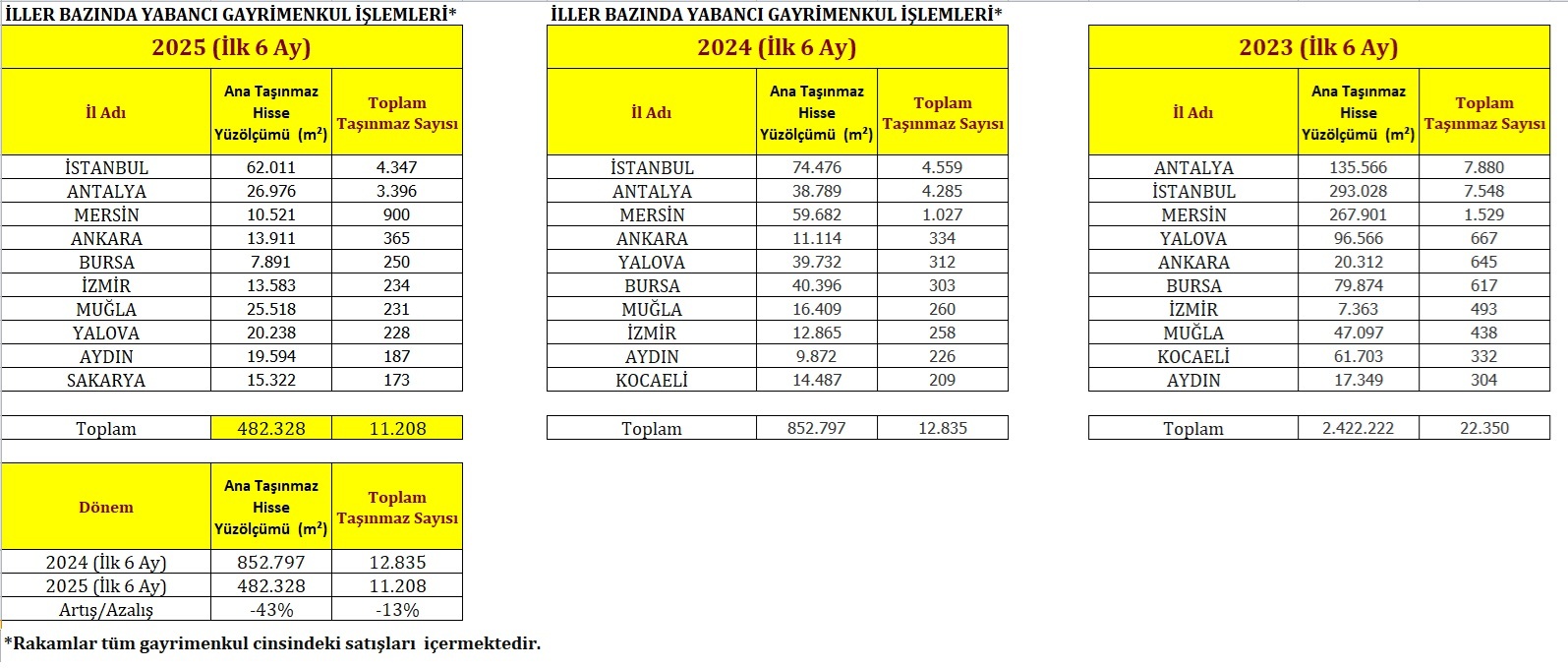 Tüm gayrimenkul cinsinden en çok tercih edilen illerde toplam hisseye isabet eden yüzölçümü bazında 2025 yılı ilk 6 ay itibariyle yabancıların gayrimenkul yatırımlarında en çok tercih ettiği il İstanbul olurken, İstanbul ilini sırası ile Antalya, Muğla, Yalova, Aydın, Sakarya, Ankara, İzmir, Mersin ve Bursa izledi.