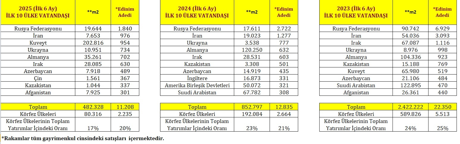 2025 yılı ilk 6 ay itibariyle, yabancıların Türkiye genelindeki toplam hisseye isabet eden yüzölçümü bazında tüm gayrimenkul yatırımları incelediğinde, yüzölçümü bazında ilk sırada Kuveyt yer alıyor. Kuveyt’i Almanya, Irak, Rusya Federasyonu, Ukrayna, Afganistan, Azerbaycan, İran, Çin ve Kazakistan takip ediyor.