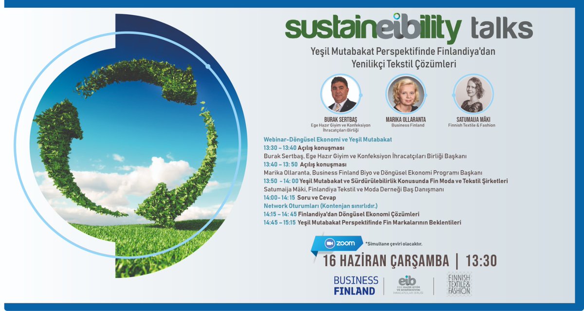 Ege Hazır Giyim ve Konfeksiyon İhracatçıları Birliği (EHKİB), “Business Finland” ve “Finnish Textile and Fashion” iş birliğiyle, 16 Haziran’daki “SUSTAINEIBILITY TALKS” webinarında, dünya genelinde çevre politikalarında, sürdürülebilir kalkınmada öncü Fin firmalarını, Türk firmalarıyla bir araya getiriyor.