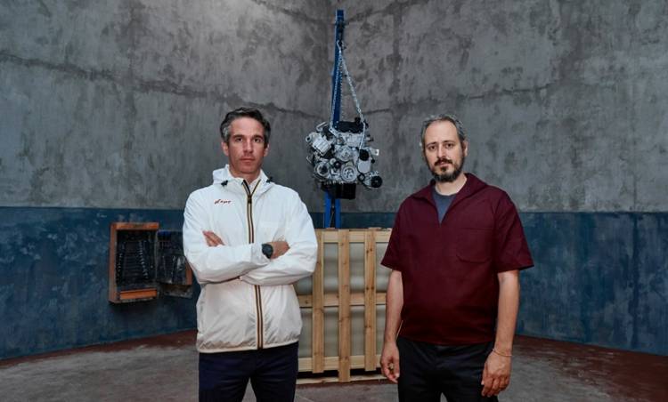 Carlo Moroni, Head of FPT Industrial Brand Communication, and Gian Maria Tosatti in front of the engine in the Italian Pavilion at the 59th International Art Exhibition