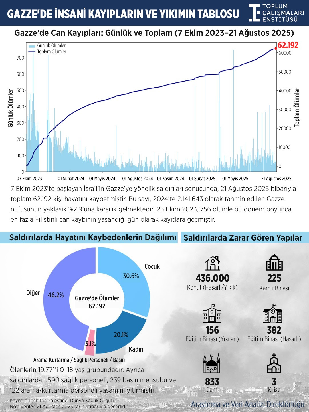 İsrail'in 7 Ekim 2023’te başladığı ve yaklaşık iki senedir süren Gazze Şeridi’ndeki saldırıları, geride acı bir bilanço bıraktı. Toplum Çalışmaları Enstitüsü’nün verilerine göre 7 Ekim 2023’ten 21 Ağustos 2025 tarihine dek geçen sürede toplam 62 bin 192 kişi İsrail’in saldırıları sonucu hayatını kaybetti.