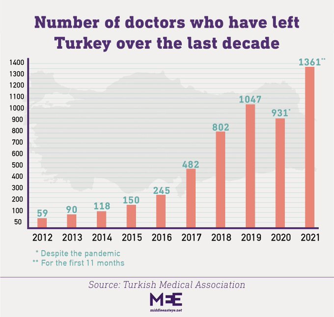 Bu gençlerin bir kısmıda TIP eğitimi alan doktor gençlerimiz. Son 10 yılda 5,285 doktor Türkiye’den göç etmiş. Rekor bu yıla ait: 1,361 doktor. Gidenlerin çoğu yeni mezun. Türkiye, 2021’de mezun olan 15 bin doktorunun yaklaşık %10’unu kaybetmiş.