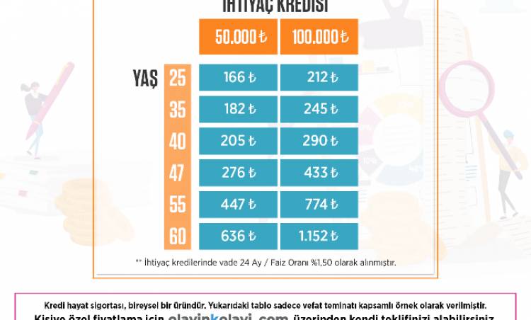Platformun yayınladığı Kredi Hayat Sigortası prim hesaplama tablosu örneğine göre, 40 yaşında olup 24 ay vade ve yüzde 1,50 faiz oranıyla 100 bin lira ihtiyaç kredisi kullanan bir tüketici, kredi hayat sigortası poliçesine sadece 290 lira ödüyor.