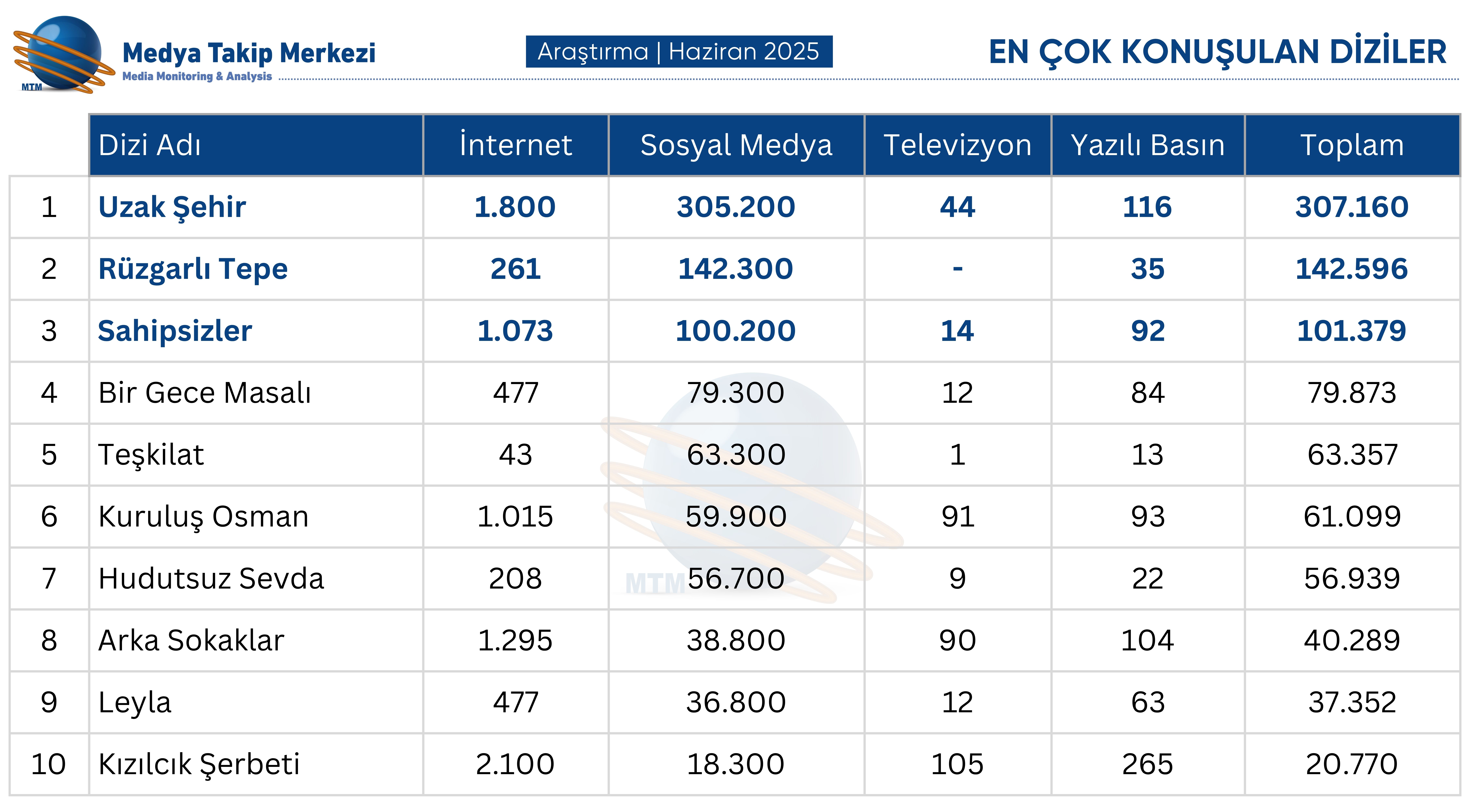 MTM Medya Takip Merkezi, Haziran 2025'te medya ve sosyal medyada en çok konuşulan televizyon dizilerini araştırdı. Rapora göre; geleneksel medyada Kızılcık Şerbeti , sosyal medyada ise Uzak Şehir'in ayın en çok konuşulan dizileri oldu.