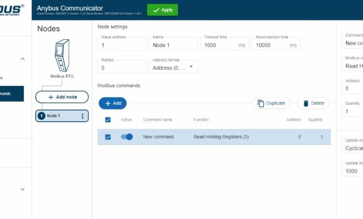 Ağ geçidini bir çıkış yolu bağlantısı PLC'sine bağlamadan önce, kullanıcı Communicator'ı bir veya daha fazlacihaz / makineden oluşan bir alt ağ ile iletişim kuracak şekilde yapılandırır. Bu bir bilgisayardan Ethernet yapılandırma bağlantı noktasına bağlanarak yapılır, daha sonra kullanıcı yeni grafiksel ve duyarlı web tabanlı 2. nesil Communicator kullanıcı arayüzüne erişmek için herhangi bir tarayıcıyı açabilir. Konfigürasyonlar basitçe sürükle bırak kullanılarak yapılır ve ek bir yazılıma gerek yoktur. Başlangıçta, 2. nesil Communicator öncelikle bağlı ekipmanla Modbus RTU iletişimine odaklanıyor. Birden fazla düğüme sahip çok karmaşık yapılandırmalara izin veren 150'ye kadar Modbus komutu desteklenir. Son yapılandırmalar ileride kullanılmak üzere güvenli bir şekilde saklanabilir ve yönetilebilir. Bittiğinde, ağ geçidi, ağ geçidinin diğer tarafındaki PLC sistemine bir düğüm olarak dahil edilmeye hazırdır. Yapılandırma bağlantı noktası ve web arayüzü de kullanıcının ağ trafiğini izlemesini ve teşhis etmesini sağlar. Kullanıcı, endüstriyel ağ bağlantısının durumunu, seri bağlantıyı ve ayrıca bireysel seri düğüm durumunu hemen görebilir. İletişim günlükleri kullanıcı tarafından daha ileri analizler için sağlanır.
