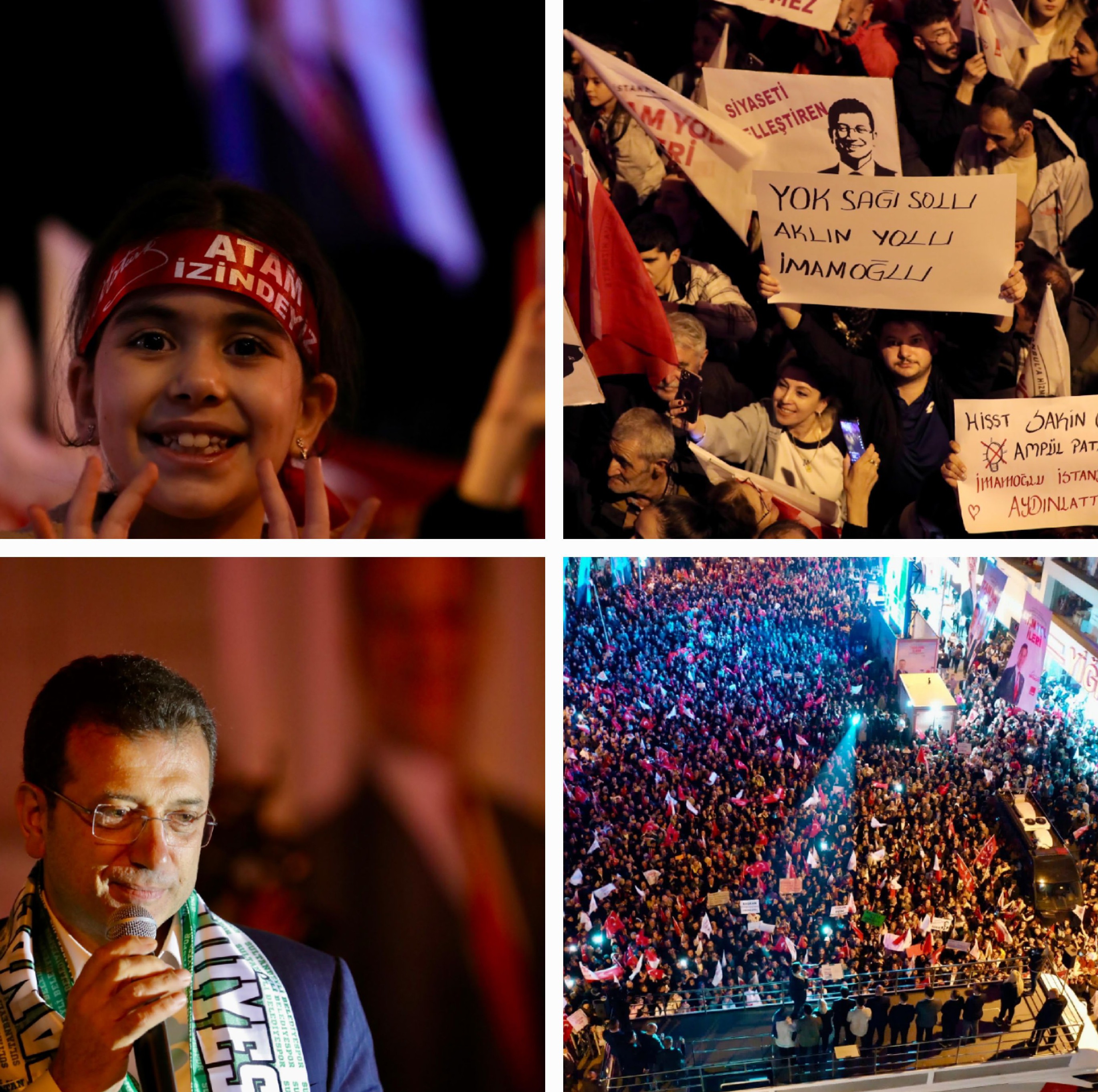 Seçimeler 2 gün kaldığını hatırlatan İmamoğlu, vatandaşlardan kendisi, Koç ve meclis üyelikleri için destek isteyen İmamoğlu, yurttaşları sandıklarda görev almaya çağırdı. Vatandaşlardan, oylarını kullandıktan sonra okul bahçelerinden ayrılmamalarını ve ortamı demokrasi şenliğine çevirmelerini isteyen İmamoğlu, 1 Nisan sabahını, “1 Nisan pazartesi sabahı kalktınız. İstanbul, mis gibi demokrasi kokacak. İstanbul, mis gibi barış kokacak, huzur kokacak. İstanbul, çok güzel bir bahar gününe uyanacak” sözleriyle tasvir etti. Alanda bulunan dövizleri kendi yorumlarıyla birlikte okuyan İmamoğlu, şunları söyledi: