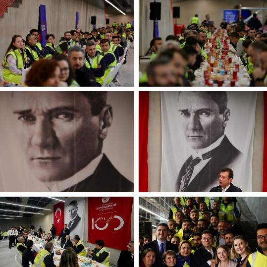 İstanbul Büyükşehir Belediye (İBB) Başkanı Ekrem İmamoğlu, Göztepe-Ataşehir- Ümraniye metro hattında çalışan 300’den fazla emekçiyle iftar sofrasında buluştu. CHP milletvekili Ali Gökçek ve CHP Ataşehir Belediye Başkan adayı Onursal Adıgüzel de hattın Ataşehir şantiyesinde, yer altında düzenlenen iftar programında İmamoğlu’na eşlik etti. Konuşmasına, hatta emeği geçen tüm paydaşlara teşekkür ederek başlayan İmamoğlu, “Bugün biz burada sizin çalışma ortamınızı hissetmeye ve sizlerin sofrasında bulunmayı kendimize seçtik. Ne mutlu bize. Çok özel bir hizmet yapıyorsunuz. İstanbul'umuza belki de tarihinin en önemli hizmetlerini sunan projelerin başında, metro yapıları geliyor. Metro yapıları yapmak teknolojisiyle, mühendisliğiyle, maliyetiyle her aşaması ayrı bir titizlik gerektiriyor. Bu manada topyekun, bütüncül yapı için emeği geçen herkesin ortaya koyduğu performans İstanbul ve İstanbul halkı için önemli” dedi.