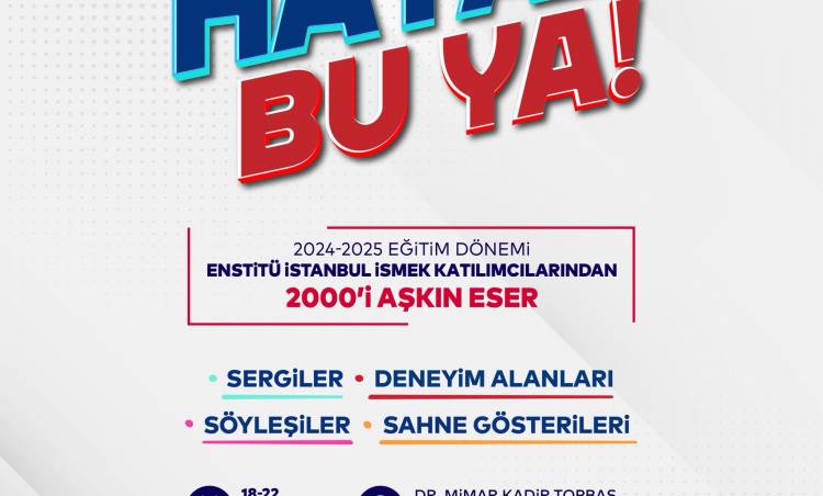 Enstitü İstanbul İSMEK’ten 2024-2025 eğitim döneminde eğitim alan katılımcıların yeteneğini ve emeğini yansıtan 2 bini aşkın eserin yer aldığı yıl sonu sergisinin hazırlıklarını tamamladı. Katılımcıların bir eğitim yılı boyunca emekle, tutkuyla ve sevgiyle ortaya koyduğu eserler İstanbulluların beğenisine sunulacak. 19 Haziran 2025 Perşembe günü başlayacak “Hayal Bu Ya!” festivali 22 Haziran’a kadar devam edecek.