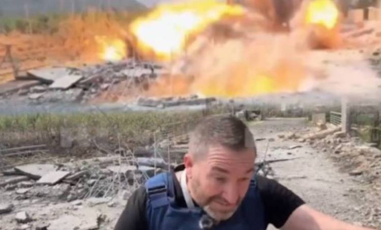 Görüntülerde, gazetecilerin hemen arkalarında büyük bir patlamanın meydana geldiği ve çevrenin toz bulutuyla kaplandığı görülüyor.