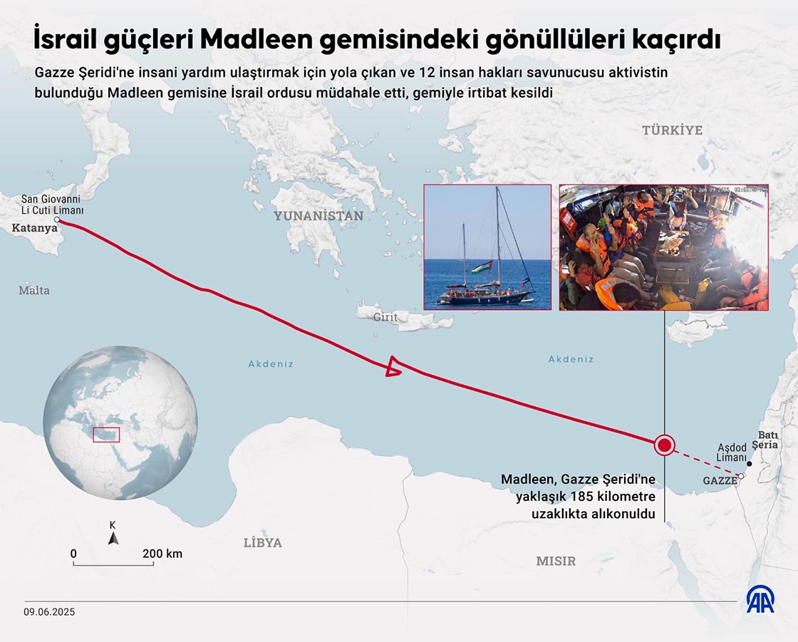 İsrail Dışişleri Bakanlığından yapılan açıklamada, Madleen gemisindeki 12 aktivistin durumuna ilişkin bilgi verildi. Açıklamada, İsrail ordusunun, Gazze Şeridi'ne yaklaşık 185 kilometre uzaklıkta alıkoyduğu Madleen gemisinin İsrail'e götürüldüğü belirtilerek, aktivistlerin ülkelerine gönderileceği bildirildi. İsrail Dışişleri Bakanlığı, alıkonulan insan hakları savunucularının videosunu da paylaştı. Videoda, aktivistlerin İsrail ordusunun baskınında yara almadığı görülüyor.
