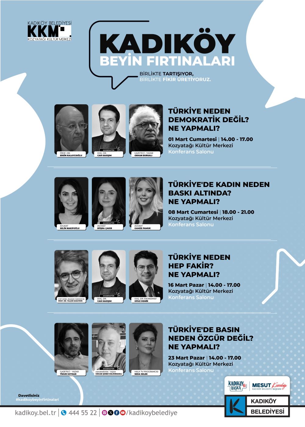 Kadıköy Belediyesi ve İdeaPolitik Enstitü iş birliğiyle düzenlenen “Kadıköy Beyin Fırtınaları” panel dizisi, 1 Mart’ta başlıyor. Mart ayı boyunca her hafta sonu Kadıköy Belediyesi Kozyatağı Kültür Merkezi’nde gerçekleştirilecek panellerde, Türkiye’nin toplumsal meseleleri ele alınacak. Etkinlikler, katılımcıların fikir ve görüşleriyle aktif olarak katkı sunabileceği interaktif bir tartışma ortamı yaratmayı hedefliyor.