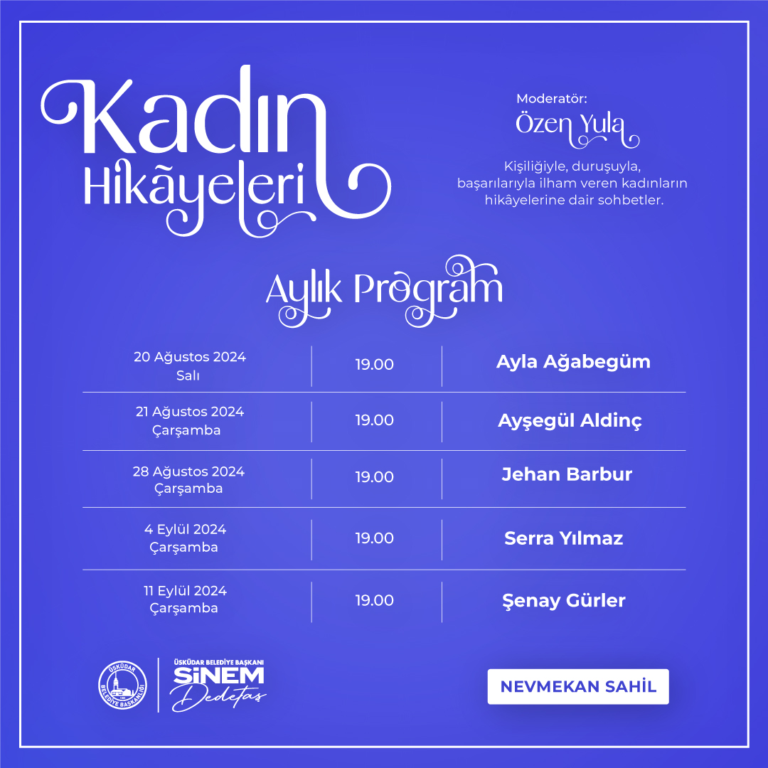 Kişiliğiyle, duruşuyla, başarılarıyla ilham veren kadınların hikayelerine dair sohbetlerin gerçekleşeceği programın ilki yazar Ayla Ağabegüm’ün katılımıyla 20 Ağustos Salı günü saat 19.00 ile 20.00 arasında gerçekleşecek. Moderatörlüğünü Özen Yula üstlenecek programda, Ağabegüm hikayelerini katılımcılarla paylaşacak.