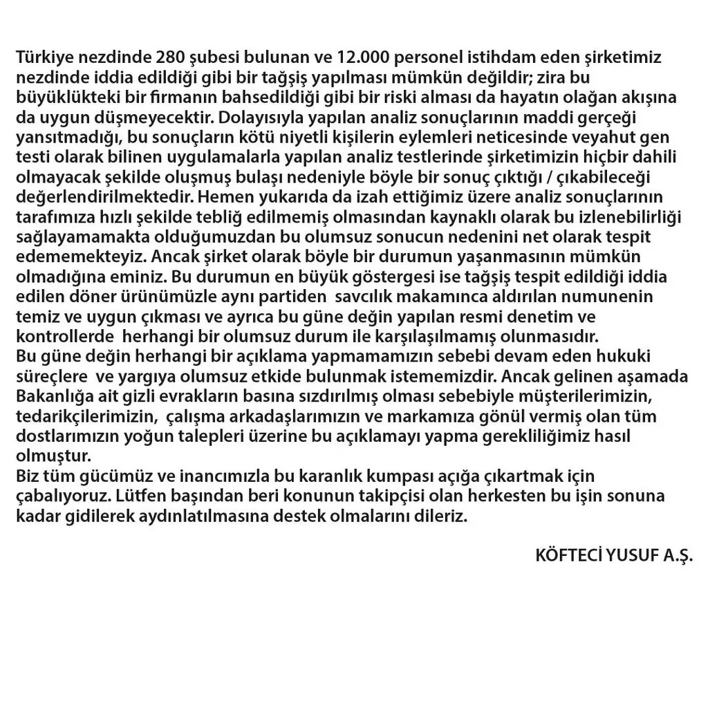 Türkiye nezdinde 280 şubesi bulunan ve 12.000 personel istihdam eden şirketimiz nezdinde iddia edildiği gibi bir tağşiş yapılması mümkün değildir; zira bu büyüklükteki bir firmanın bahsedildiği gibi bir riski alması da hayatın olağan akışına da uygun düşmeyecektir. Dolayısıyla yapılan analiz sonuçlarının maddi gerçeği yansıtmadığı, bu sonuçların kötü niyetli kişilerin eylemleri neticesinde veyahut gen testi olarak bilinen uygulamalarla yapılan analiz testlerinde şirketimizin hiçbir dahili olmayacak şekilde oluşmuş bulaşı nedeniyle böyle bir sonuç çıktığı / çıkabileceği değerlendirilmektedir. Hemen yukarıda da izah ettiğimiz üzere analiz sonuçlarının tarafımıza hızlı şekilde tebliğ edilmemiş olmasından kaynaklı olarak bu izlenebilirliği sağlayamamakta olduğumuzdan bu olumsuz sonucun nedenini net olarak tespit edememekteyiz. Ancak şirket olarak böyle bir durumun yaşanmasının mümkün olmadığına eminiz. Bu durumun en büyük göstergesi ise tağşiş tespit edildiği iddia edilen döner ürünümüzle aynı partiden savcılık makamınca aldırılan numunenin temiz ve uygun çıkması ve ayrıca bu güne değin yapılan resmi denetim ve kontrollerde herhangi bir olumsuz durum ile karşılaşılmamış olunmasıdır. Bu güne değin herhangi bir açıklama yapmamamızın sebebi devam eden hukuki süreçlere ve yargıya olumsuz etkide bulunmak istememizdir. Ancak gelinen aşamada Bakanlığa ait gizli evrakların basına sızdırılmış olması sebebiyle müşterilerimizin, tedarikçilerimizin, çalışma arkadaşlarımızın ve markamıza gönül vermiş olan tüm dostlarımızın yoğun talepleri üzerine bu açıklamayı yapma gerekliliğimiz hasıl olmuştur.