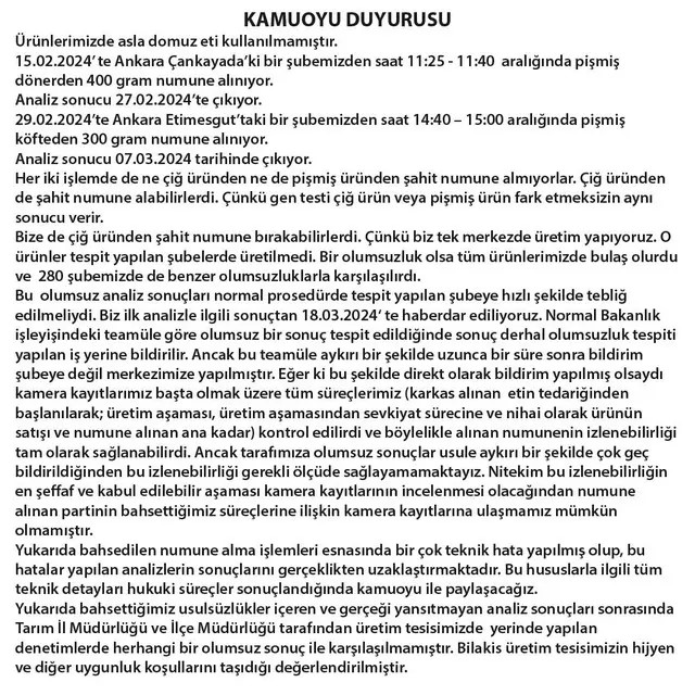"Ürünlerimizde asla domuz eti kullanılmamıştır. 15.02.2024'te Ankara Çankaya'daki bir şubemizden saat 11:25 - 11:40 aralığında pişmiş dönerden 400 gram numune alınıyor. Analiz sonucu 27.02.2024'te çıkıyor. 29.02.2024'te Ankara Etimesgut'taki bir şubemizden saat 14:40-15:00 aralığında pişmiş köfteden 300 gram numune alınıyor. Analiz sonucu 07.03.2024 tarihinde çıkıyor. Her iki işlemde de ne çiğ üründen ne de pişmiş üründen şahit numune almıyorlar. Çiğ üründen de şahit numune alabilirlerdi. Çünkü gen testi çiğ ürün veya pişmiş ürün fark etmeksizin aynı sonucu verir. Bize de çiğ üründen şahit numune bırakabilirlerdi. Çünkü biz tek merkezde üretim yapıyoruz. O ürünler tespit yapılan şubelerde üretilmedi.