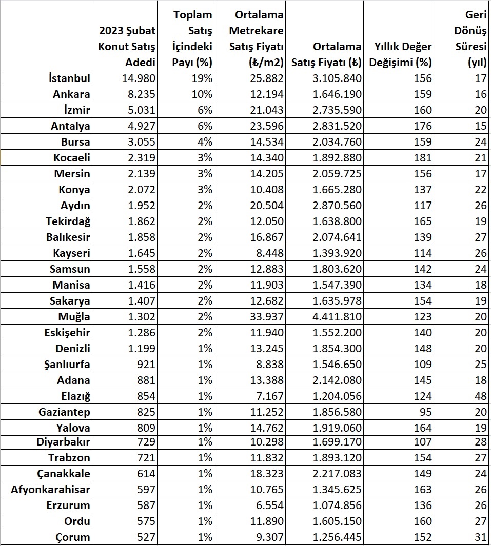 Şubat ayında konut satışlarında İstanbul 14 bin 980 konut satışı ve %19 ile en yüksek paya sahip oldu. Satış sayılarına göre İstanbul'u 8 bin 235 konut satışı ve %10 pay ile Ankara, 5 bin 31 konut satışı ve %6 pay ile İzmir izledi. Endeksa verilerine göre, şubat ayı sonu itibarı ile İstanbul’da konut satış fiyatlarında değer artışı %156, ortalama konut metrekare satış fiyatı 25 bin 882 TL, ortalama konut fiyatı 3 milyon 105 bin 840 TL. Ankara’da konut fiyatları son bir yılda %159 artış gösterdi, ortalama konut metrekare satış fiyatı 12 bin 194 TL, ortalama konut fiyatı 1 milyon 646 bin 190 TL. İzmir’de ise yıllık değer artışı %160, ortalama konut metrekare satış fiyatı 21 bin 43 TL, ortalama konut fiyatı 2 milyon 735 bin 590 TL oldu.