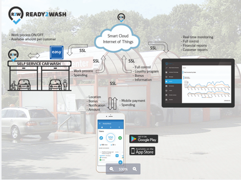 Kullanıcılar, IoT bağlantısıyla, uygulama üzerinden yıkama teknesini seçebilir ve gereken "sanal" jeton sayısını girebilir. Ready2Wash sunucusu, easyE4'ün yıkama fonksiyonlarını uygun şekilde kontrol edebilmesi için kaç jeton atandığını ağ geçidi aracılığıyla ilgili easyE4 kontrol rölesine rapor eder. Hanle şirketinin merkez ofisi, bulut bağlantısı aracılığıyla, çeşitli araç yıkama merkezlerindeki tüm müşterilerin tüm faaliyetleri hakkında sürekli olarak bilgilendirilir.