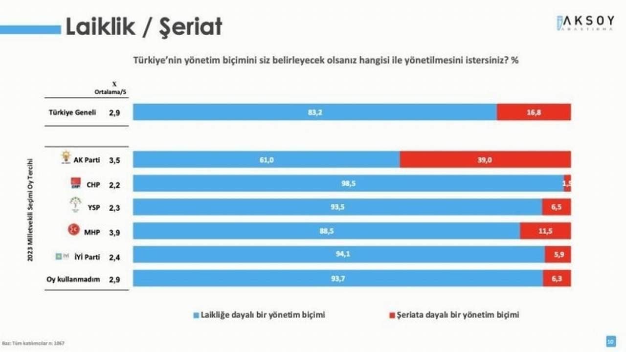 Aksoy Araştırma’nın sahibi Ertan Aksoy anketi yüzde 95 güven aralığında yüzde 3 hata payıyla 1067 kişi ile gerçekleştirildiğini ifade ederken ankette laikliğe dayalı yönetim biçimi diyenlerin oranı yüzde 83,2 olurken, şeriata dayalı yönetim biçimi diyenlerin oranı yüzde 16,8'de kaldı.Araştırmanın ayrıntılarında hangi partinin seçmeninin hangi yönetim şeklinden yana oy kullandığı da yer aldı.