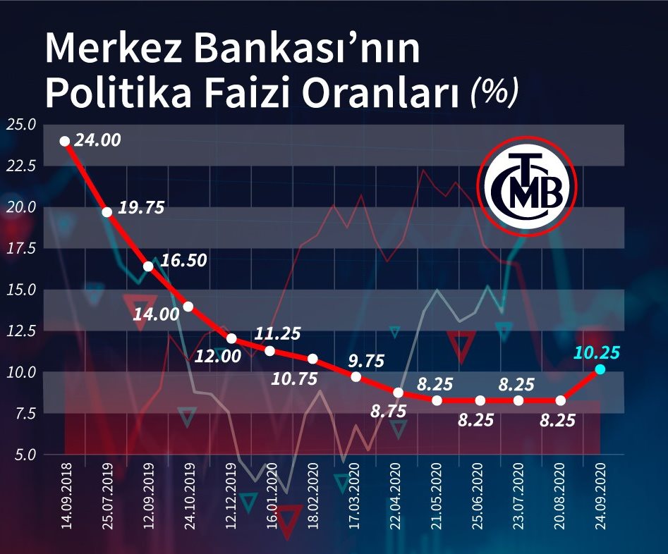 Merkez Bankası yüzde 8.25 seviyesinde bulunan politika faizini yüzde 10.25 seviyesine çıkardı. Piyasaların genel beklentisi faizin değişmeyeceği yönündeydi. Merkez politika faizini mayıs ayında yüzde 8.25’e düşürmüş, haziran, temmuz ve ağustos aylarında değişiklik yapmamıştı.