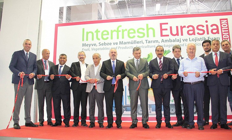 Interfresh Eurasia Fuarı’na yaş meyve sebze ihracatçı birlikleri ortak stantla katılırken, fuarın açılışına Antalya Valisi Hulusi Şahin, Kepez Kaymakamı Nusret Şahin, TAGEM Genel Müdürü Sayın Dr. Metin Türker, Ege Yaş Meyve Sebze İhracatçıları Birliği Başkanı Hayrettin Uçak, EYMSİB Yönetim Kurulu Üyesi Vural Güleç, Uludağ Yaş Meyve İhracatçıları Birliği Başkanı Senih Yazgan, Batı Akdeniz İhracatçı Birliği Başkanı Ümit Mirza Çavuşoğlu katıldı.