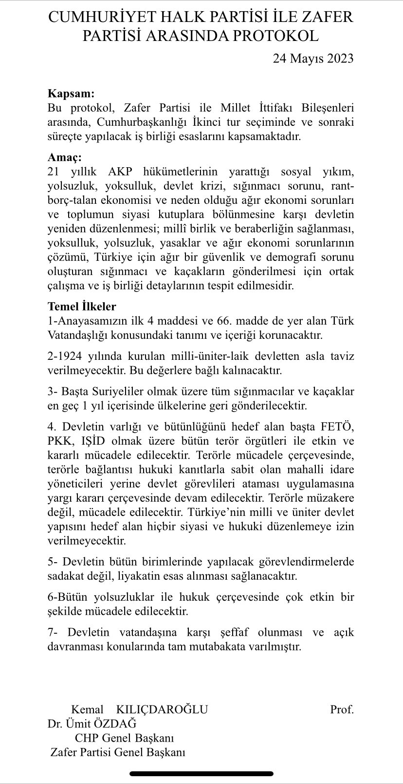 AKP Genel Başkanvekili Numan Bey bizi ziyaret etti. Bizden destek istediler. Kendilerine sorduk, “Sığınmacılar konusunda ne yapmayı düşünüyorsunuz?” Anlattıkları şey sığınmacıların vatanlarına dönmesini içermiyordu. Kemal Bey’le görüştük. Kemal Bey çok net bir şekilde sığınmacıların vatanlarına dönmesi gerektiğini ve bu politikayı izleyeceğini söyledi. Bu politikanın detaylarını konuştuk. Zafer Partisi’nin önermiş olduğu bir sene içerisinde uluslararası hukuka uygun, insan haklarını gözeten, dönen Suriyelilerin Suriye’de güvenliğini sağlayacak ama Türk ekonomisinin üzerindeki büyük yükü de kaldıracak, sokaklarımızı tekrar güvenli hale getirecek, uyuşturucu çetelerini sokaklarımızdan, okulların önünden çözecek bir model üzerinde kendisi ile fikir birliğine vardık. Bundan dolayı da Zafer Partisi olarak Sayın Kılıçdaroğlu’nun Cumhurbaşkanlığı seçimlerinde ikinci turda destekleme kararı verdik. Hayırlı olsun.
