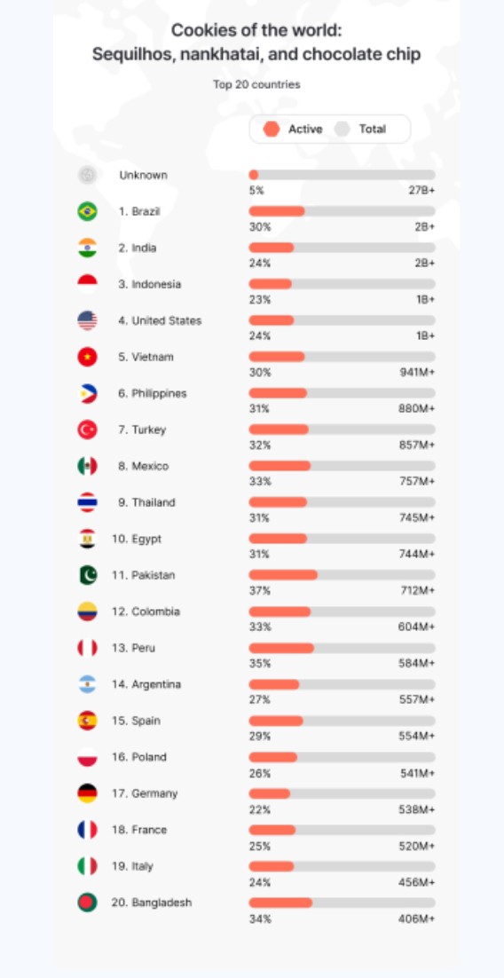 Araştırmada kullanılan çerezlere dair veri kümesinde 244 ülke ve bölge temsil ediliyordu ve bu da kötü amaçlı yazılım sistemlerinin ne kadar büyüdüğünü gösteriyor. En fazla çerez, şu ülkelerden geldi: Brezilya (2,1 milyar), Hindistan (2 milyar), Endonezya (1,5 milyar), ABD (1,4 milyar), Vietnam (941 milyon), Filipinler (880 milyon) ve Türkiye (857 milyon). Türkiye'den toplanan çerezlerin %32'si aktifti.