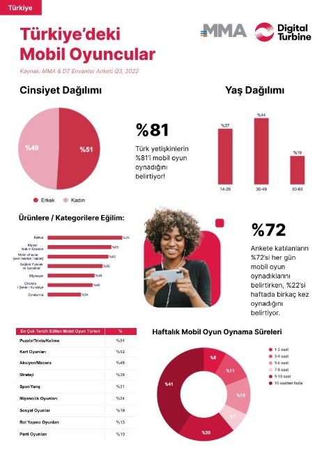 Digital Turbine, mobil oyun pazarının ve mobil oyun reklam gelirlerinin rekorlar kırmasıyla Türkiye’deki kullanıcıların mobil oyun ve reklamlara yaklaşımlarını analiz eden bir araştırmaya imza attı. Mobile Marketing Assosiation (MMA) işbirliğiyle gerçekleştirilen “Türkiye’deki Mobil Oyuncular” araştırmasına göre Türkiye’deki kullanıcıların yüzde 81’i mobil oyun oynadığını belirtiyor. Mobil oyun oynayanların yüzde 51’inin erkek, yüzde 49’unun kadın olması ise ‘mobil oyunları yalnızca erkekler oynar’ tabusunu yıkıyor. Türk mobil oyuncuların yüzde 41’i haftada 10 saatten fazla mobil oyun oynuyor. Kullanıcıların yüzde 51’i günde 2-3 kez mobil oyun oynadığını belirtirken, yüzde 72’si ise gün içerisinde mutlaka mobil oyun oynadığını ifade ediyor.