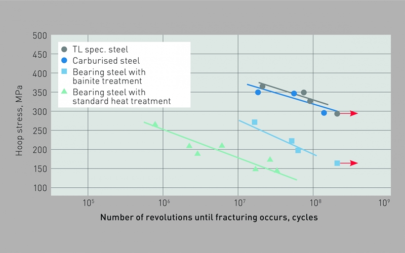 Bir dizi çatlak ölçüm testinde görüldüğü üzere TL teknik özelliğini karşılayan iç bileziklerin direnç değeri, beynitik çelikten veya standart rulman çeliğinden üretilen iç bileziklerin direnç değerinden daha yüksek. Testlerde iç bileziklere 1800 dev/dk dönüş hızında 2000 kg radyal yükün yanı sıra ölçülen bir çevresel gerilme değeri uygulandı.