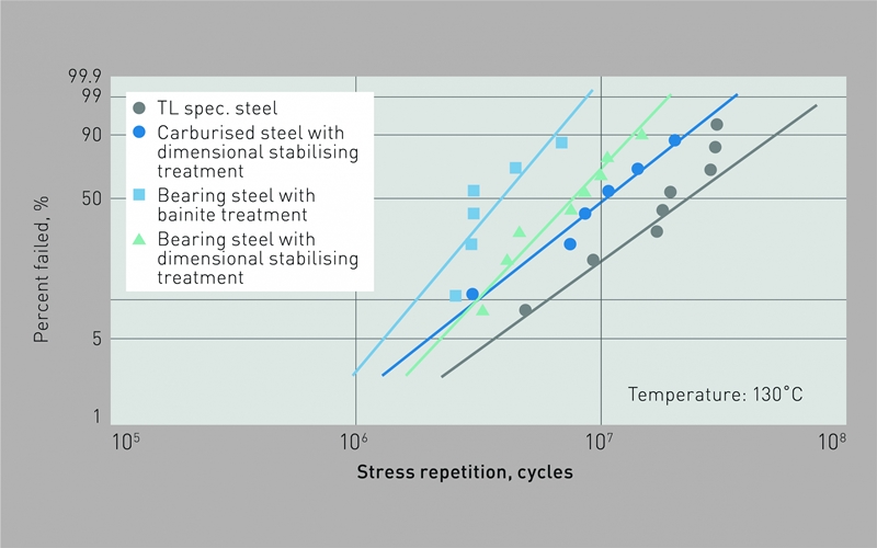 Burada; bazıları standart ısıl işlemden ve diğerleri beynit işleminden geçirilen rulman çeliklerinden üretilen bilezikler 400 MPa çevresel gerilme altında ortalama olarak sırasıyla 1 x 107 dönüş ve 7 x 107 dönüş sonrasında çatladı. Buna karşın, TL teknik özelliğini karşılayan çelik, 430 MPa çevresel gerilme altında 3 x 108 dönüş sonrasında bile çatlamadı (2. Görüntü). Aynı zamanda, TL bilezikler boyut stabilizasyon işlemi görmüş karbürlenmiş çelikten yapılan bileziklere kıyasla biraz daha yüksek performans gösterdi.