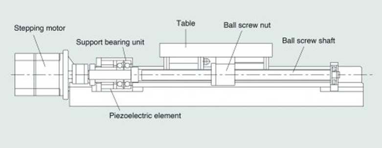 Bunun yerine, NSK Nano Konumlandırıcı vidalı milin sabit uçlu rulman ünitesinde bir piezoelektrik eleman bulunur. Piezoelektrik elemanın ön yük uygulanmış rulmanlar ile aynı mil üzerine monte edilmesi, istenmeyen moment ve radyal kuvvetlerin oluşmasını önler. Ek olarak, piezoelektrik eleman üzerinde baskı kuvveti olarak rulman ön yükünün sağlanması gerilimi önlerken rijitlikten taviz vermez.