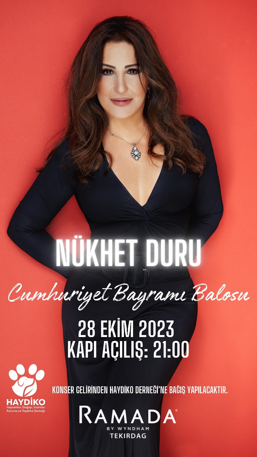 Ünlü şarkıcı Nükhet Duru, 28 Ekim'de Tekirdağ Ramada Otel'de düzenlenecek olan Cumhuriyet Bayramı Balosu'nda Haydiko (Hayvanları Doğayı İnsanları Koruma ve Yasatma Derneği) yararına sahneye çıkıyor. Gelirin tamamı deprem bölgesindeki ihtiyaç sahibi çocuklar ve hayvanlar için harcanacak.