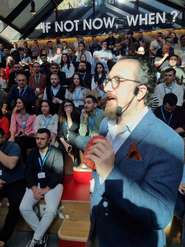 Etkinliğin konuk konuşmacısı olan Uzm. Dr. Kerem Dündar, Obaselilere “Değişen Dünyada Senin Beynin” başlıklı ilham verici bir konuşma yaparak beynin etkin kullanımının önemini vurguladı. Dündar, 'Değişen dünyada sadece yetenek değil, yetkinlik de önemlidir' diyerek deneyim ve merakın beyin gücünün etkin kullanımında kilit rol oynadığını belirtti. Ayrıca, deneyim, istikrar ve gelişimin önemine ve OBASE’de olduğu gibi kurumlarda etkileşim içinde olan beyinlerin ortak bir yolda yürüyerek fark yaratabileceğine değindi.
