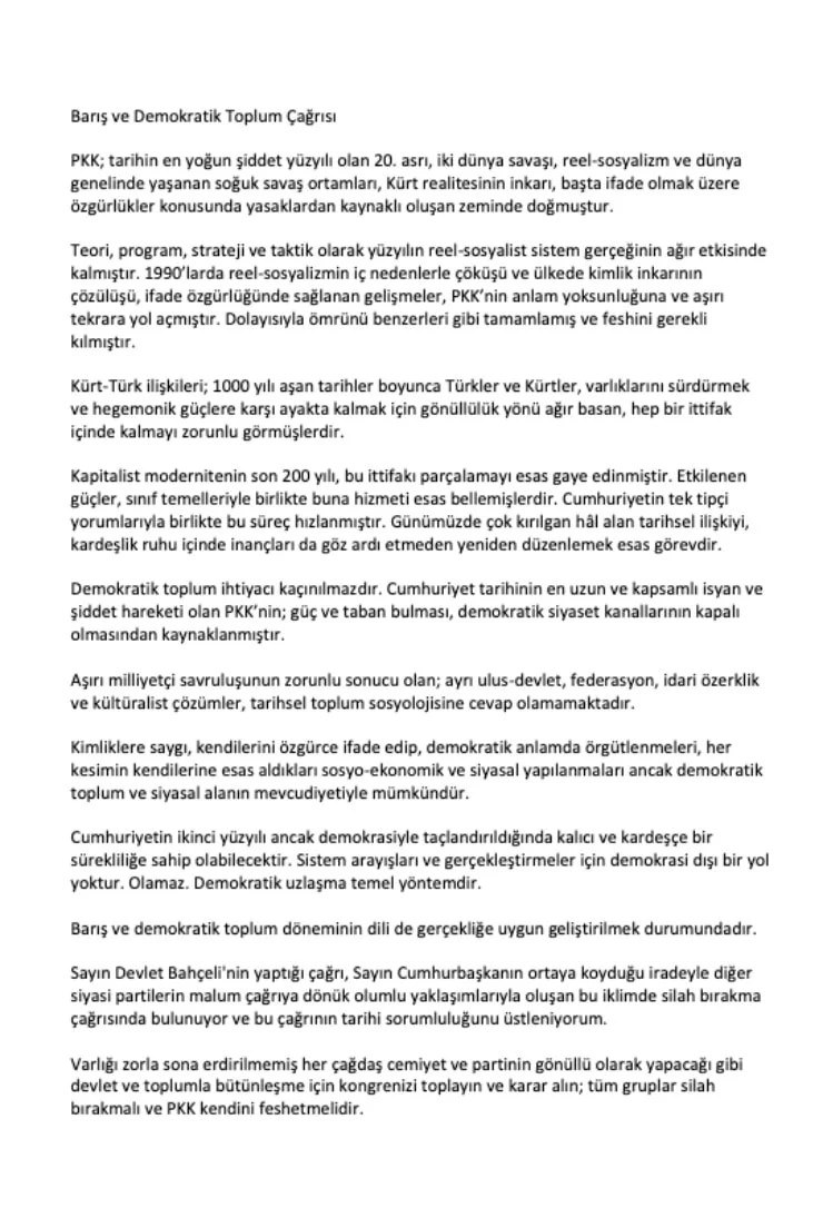 PKK lideri Abdullah Öcalan'ın örgüte silah bırakma ve kendini feshetme çağrısı, Türkiye'deki siyasi partiler arasında farklı tepkilere yol açtı. AKP Genel Başkanvekili Efkan Ala, çağrının özünün silahların bırakılması ve terör örgütünün kendini feshetmesi olduğunu belirterek, "Biz sonuca bakarız" dedi.
